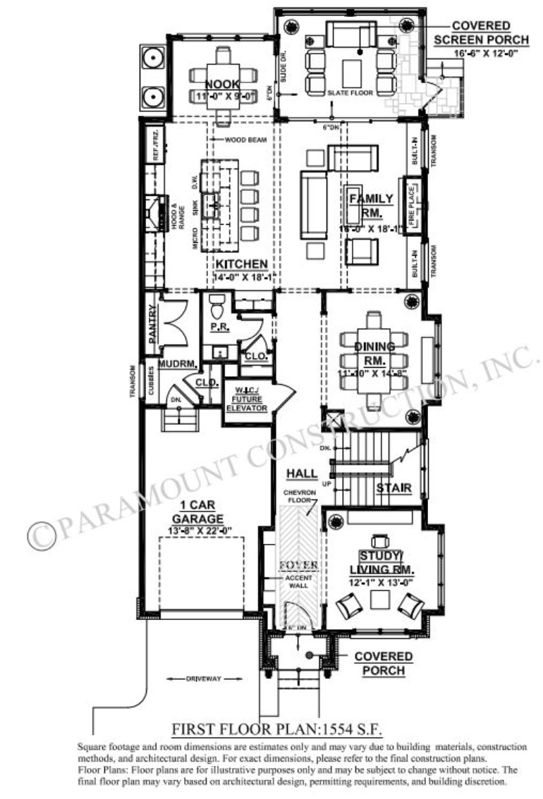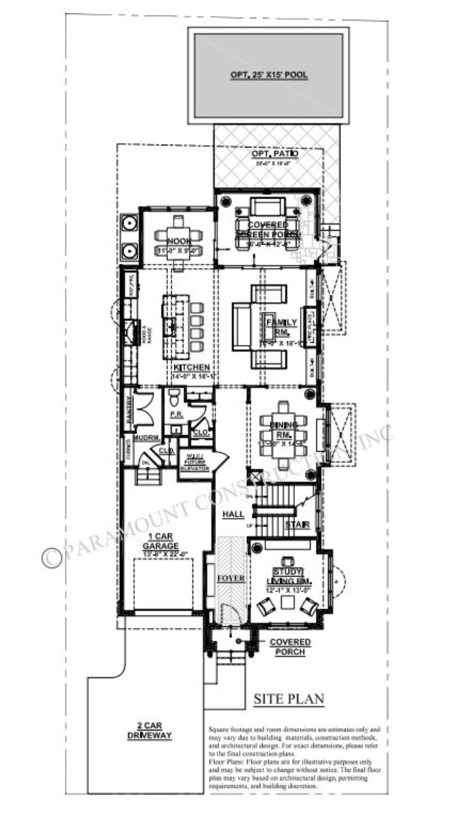 This new home includes a one-car garage, an optional pool, a patio, and a covered porch. The architectural plan emphasizes spaciousness and modern luxury, featuring coffered ceilings and extensive glass walls that lead to outdoor spaces, including an optional four-stop elevator.